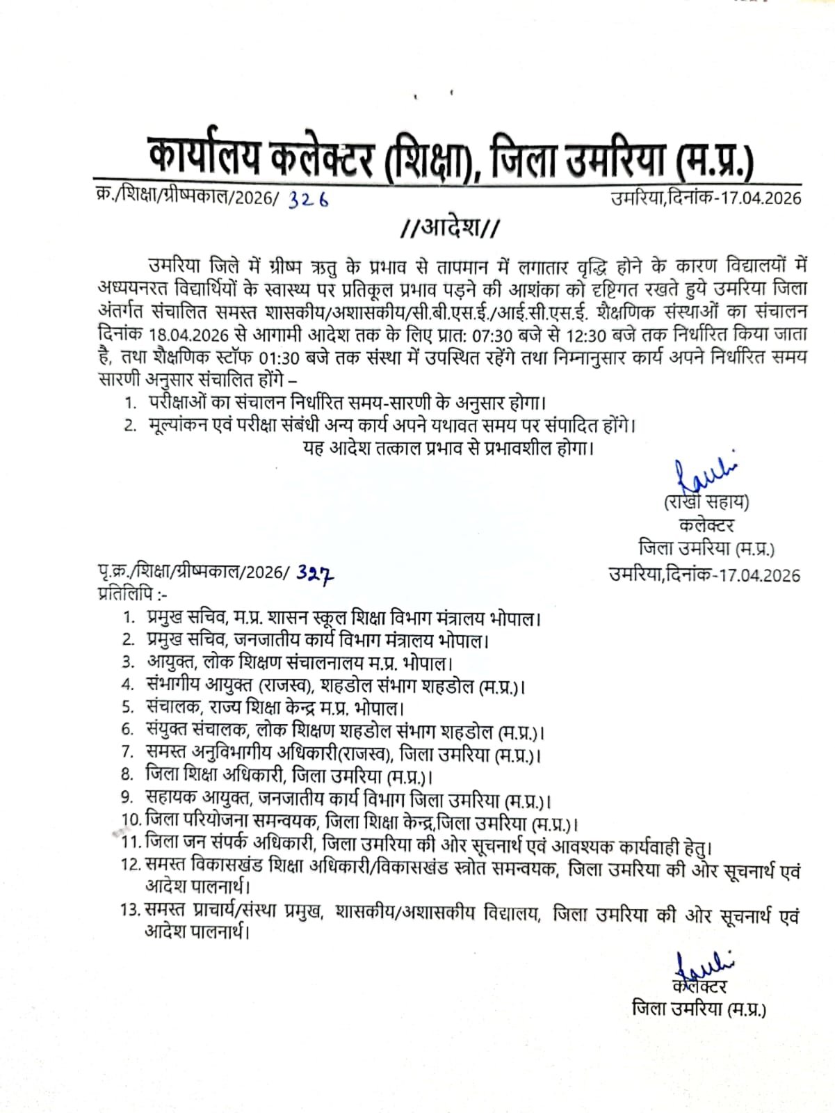 जिले में लगातार बढ़ते तापमान और ग्रीष्म ऋतु के प्रभाव को देखते हुए कलेक्टर राखी सहाय ने विद्यार्थियों के स्वास्थ्य को प्राथमिकता देते हुए शैक्षणिक संस्थाओं के संचालन समय में परिवर्तन किया है। जारी आदेश के अनुसार उमरिया जिले के अंतर्गत संचालित सभी शासकीय, अशासकीय, सीबीएसई एवं आईसीएसई बोर्ड से संबद्ध विद्यालयों का संचालन 18 अप्रैल से आगामी आदेश तक प्रातः 7.30 बजे से दोपहर 12.30 बजे तक किया जाएगा।