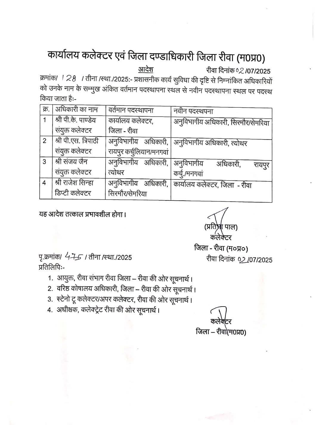 आदेश में पी. के. पाण्डेय संयुक्त कलेक्टर कार्यालय कलेक्टर, जिला – रीवा को अनुविभागीय अधिकारी, सिरमौर/सेमरिया,पी.एस. त्रिपाठी संयुक्त कलेक्टर अनुविभागीय अधिकारी, रायपुर कर्चुलियान/मनगवां को अनुविभागीय अधिकारी, त्योथर, संजय जैन संयुक्त कलेक्टर को अनुविभागीय अधिकारी, त्योथर को अनुविभागीय अधिकारी, रायपुर कर्चु./मनगवां और राजेश सिन्हा डिप्टी कलेक्टर अनुविभागीय अधिकारी, सिरमौर/सेमरिया को कार्यालय कलेक्टर, जिला – रीवा में पदस्थ किए जाने की तबादला सूची जारी की है।