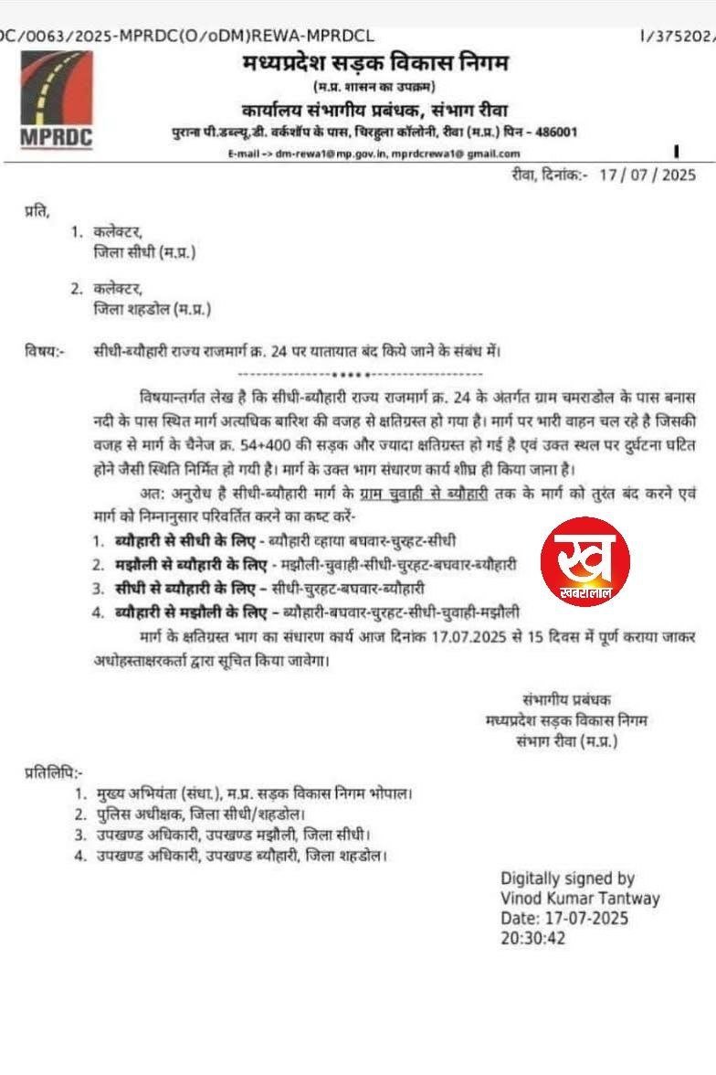 इसलिए मध्यप्रदेश सड़क विकास निगम ने कलेक्टर सीधी को पत्र लिखकर सीधी-ब्यौहारी मार्ग के ग्राम चुवाही से ब्यौहारी तक के मार्ग को तुरंत बंद करने एवं मार्ग को निम्नानुसार परिवर्तित करने का आवदेन भी दिया है।